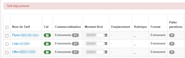 Réponse 1 : Ce message est basé sur l'existence d'autres tarifs ayant notamment dans la liste de prix le même format + emplacement + rubrique + Position/page + Dossier + Evénement + type tarif/commercialisation...